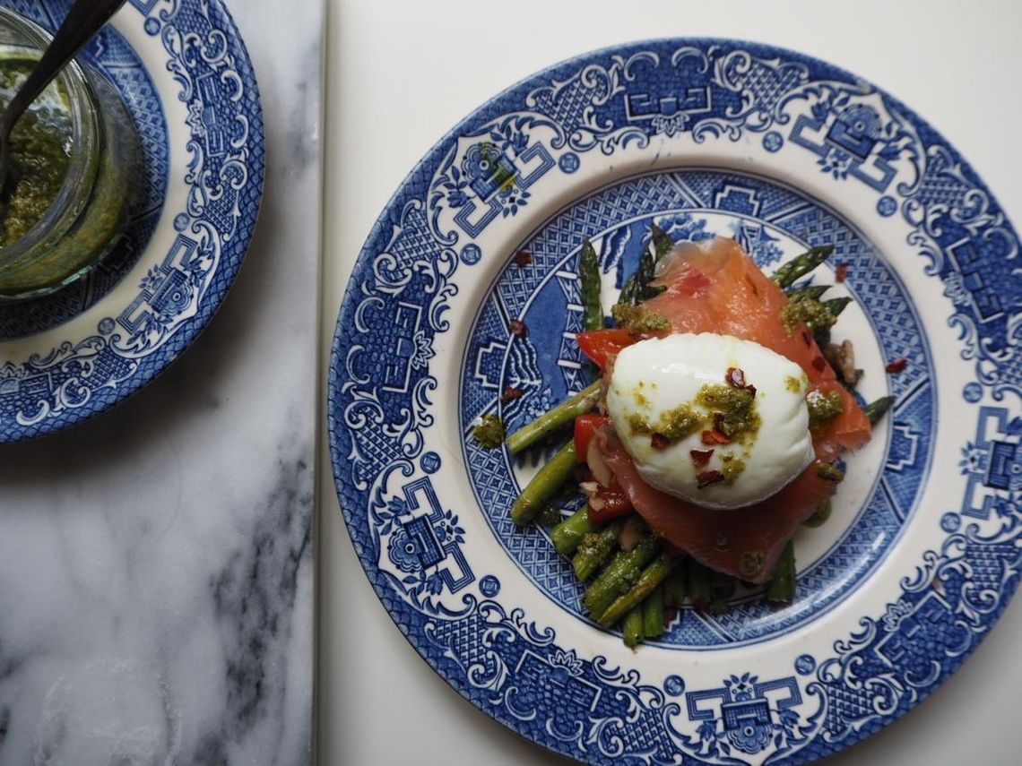 Eggs, asparagus & salmon stack with a pesto drizzle
