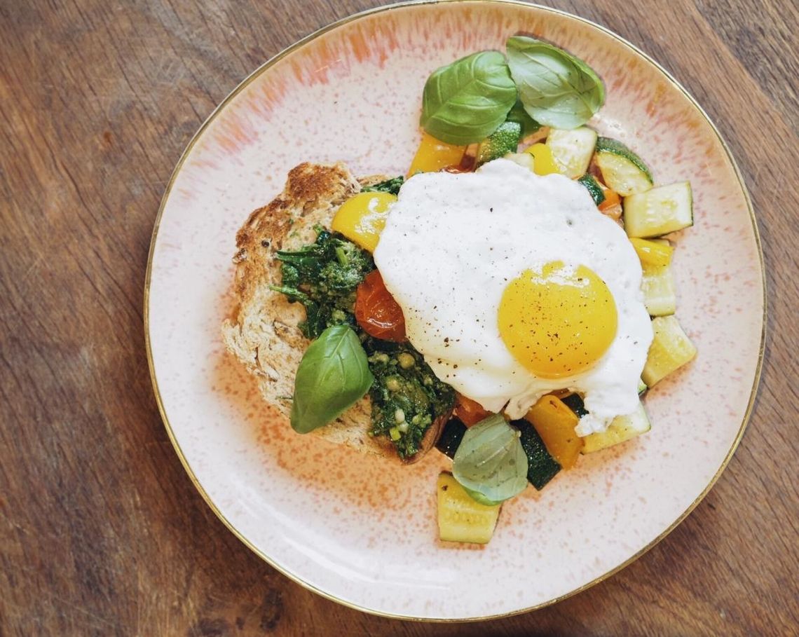 - Put the dish together by topping the toast with the pesto, roasted veg and runny egg on top.