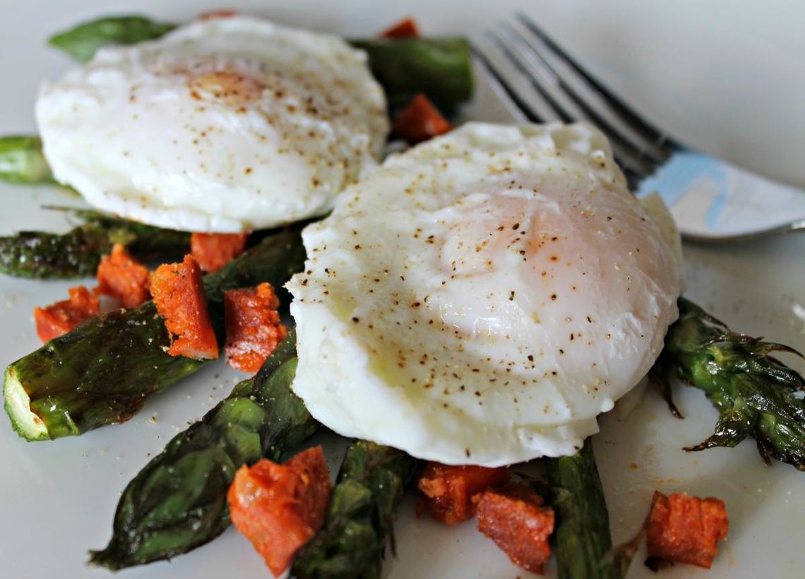 6. Arrange the asparagus and chorizo on your plate, place the eggs on top and grind some black pepper over the dish