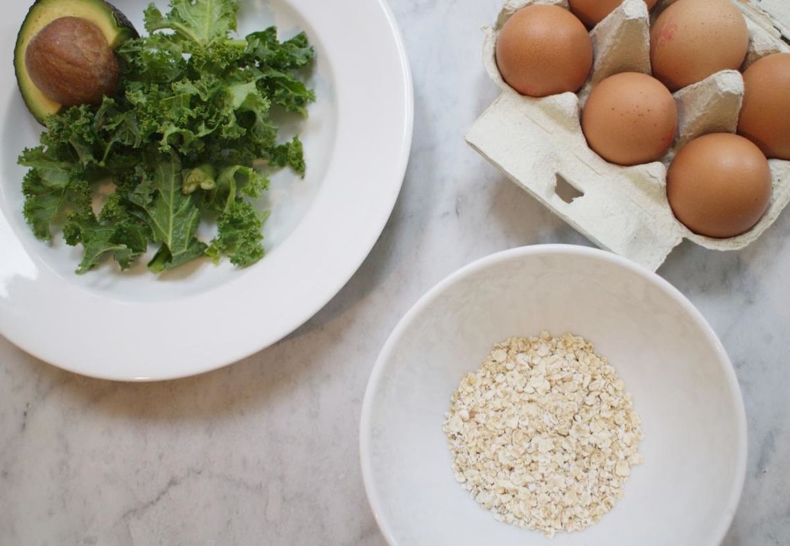 - Then its the important part, the plating up! Porridge first with a side of kale and avocado and then the egg on top.