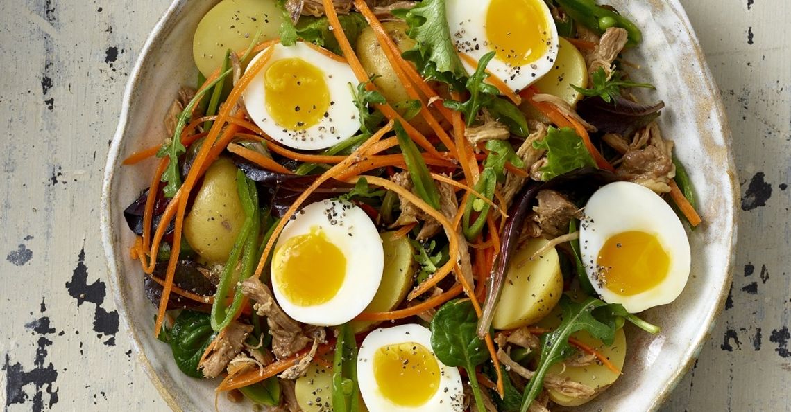 8. Mix the salad leaves with the sugar snaps and julienned carrot. Place the salad on a big plate or platter. Arrange the potatoes and chicken over the top of the salad and finally add the eggs.