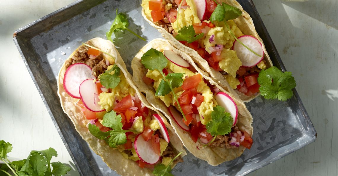 Breakfast tacos with scrambled eggs, beef mince and tomato salsa