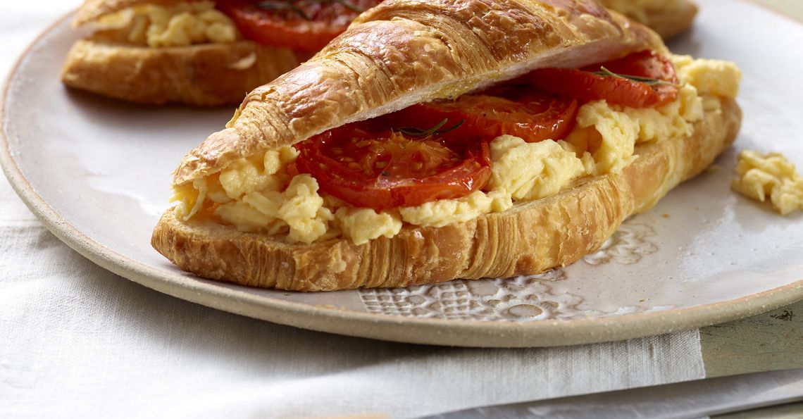 Croissants with creamy scrambled eggs and slow roasted rosemary tomatoes