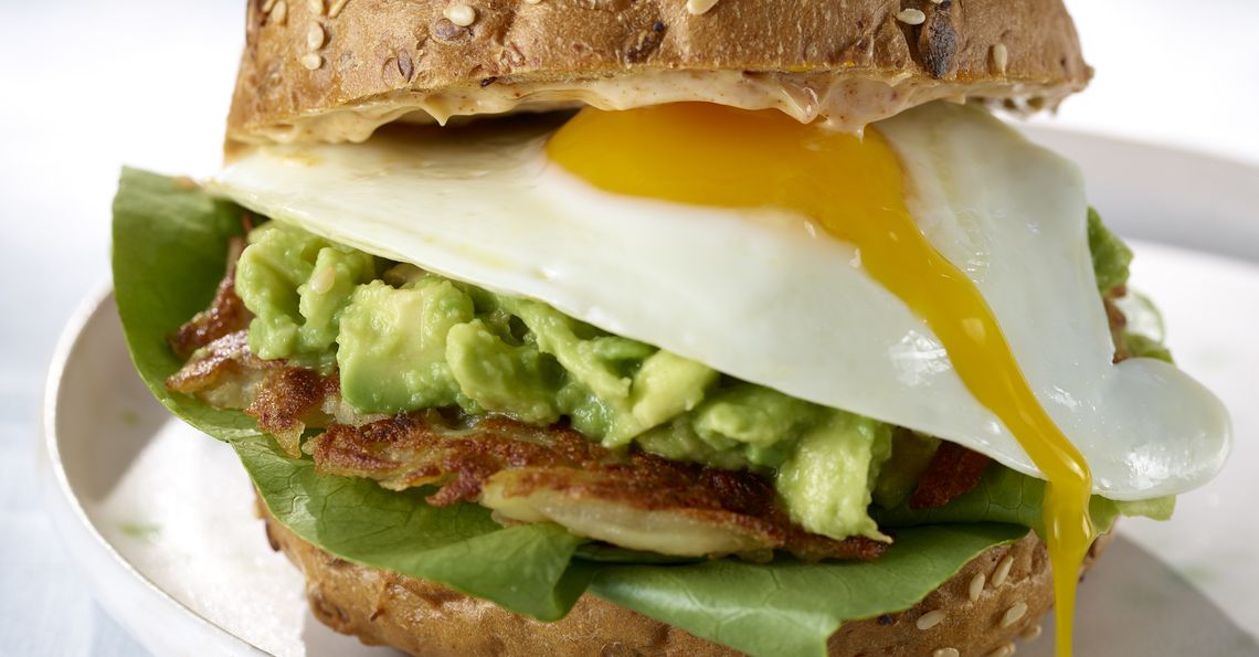 Fried egg burgers with smashed avocado, crispy potato pancake and smoked paprika sauce