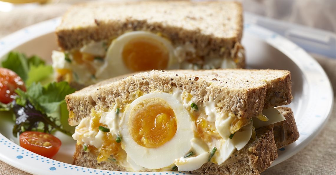 - Divide half the egg mayonnaise between two slices of bread, place one of the eggs in the centre of each, then cover with the rest of the egg mayo. Top with the slices of bread and cut in half. Wrap for a feast on the go.