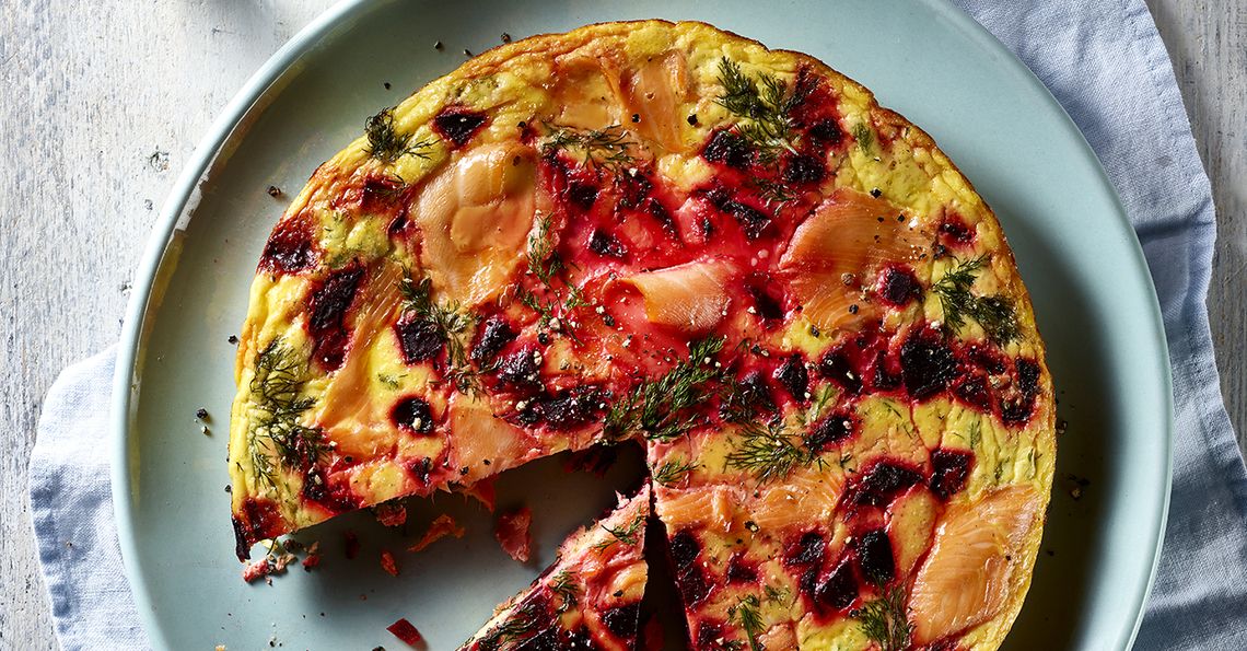3. Sprinkle ¾ of each of the beetroot and smoked salmon into the pan then pour over the egg mixture. Scatter with the remaining beetroot, smoked salmon and dill. Reduce the heat to low/medium and cook for 10 minutes to set the base then transfer to the oven to bake for 8-10 minutes or until set.