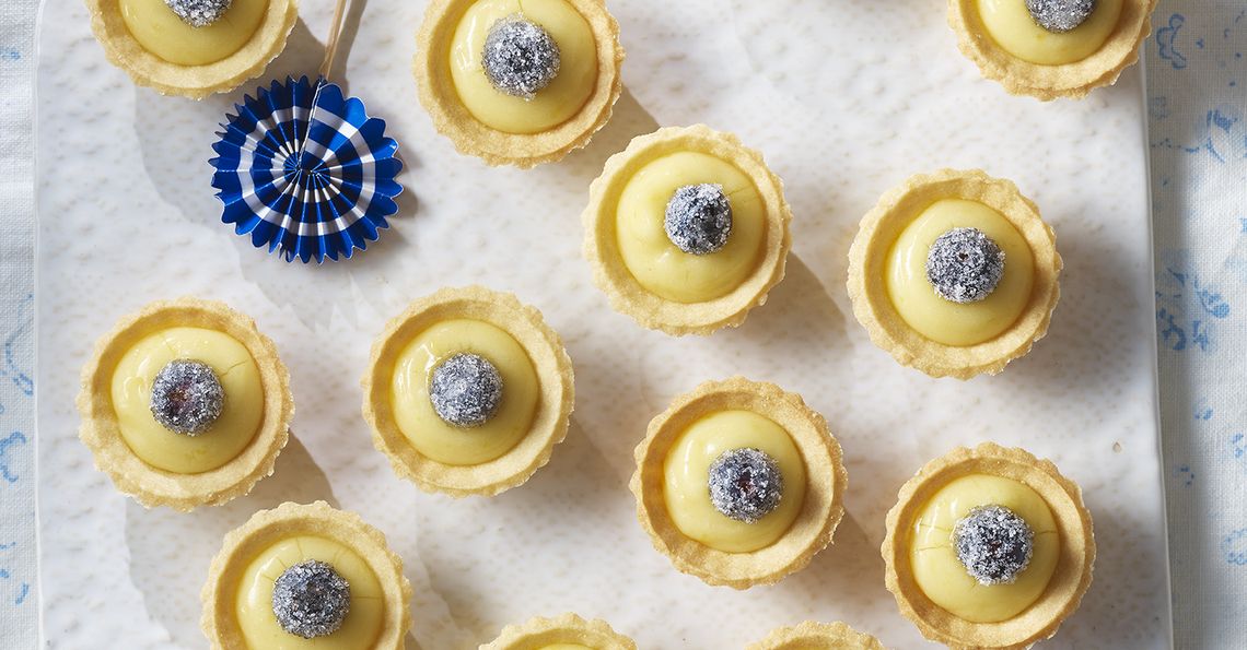 - Treat yourself to these tempting mini tarts which are made using ready-made tart cases so they are super-simple to make. Filled with homemade lemon curd and topped with blueberries, they are cleverly frosted by coating in egg white and rolling in sugar. For the curd and frosting, remember to always use British Lion eggs which guarantees they’re safe to eat raw, even for vulnerable groups including pregnant women and older people.