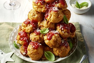 Cheese gougeres with tomato chilli jam Serves: 10 Prep: 15 mins Cook: 30 mins Spice up your festive spread with out Cheese Grougeres, paired with a tomato chilli...